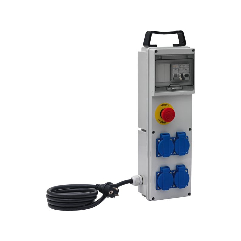 Protection différentielle 30mA - 16 A - 230V. Munis d'un dispositif d'arrêt d'urgence. Équipé de 4 prises de courant 2P+T 16 A - 230 V à clapets. Puissance : 3 680 W Indice de protection : IP44 Norme : NFC 15100