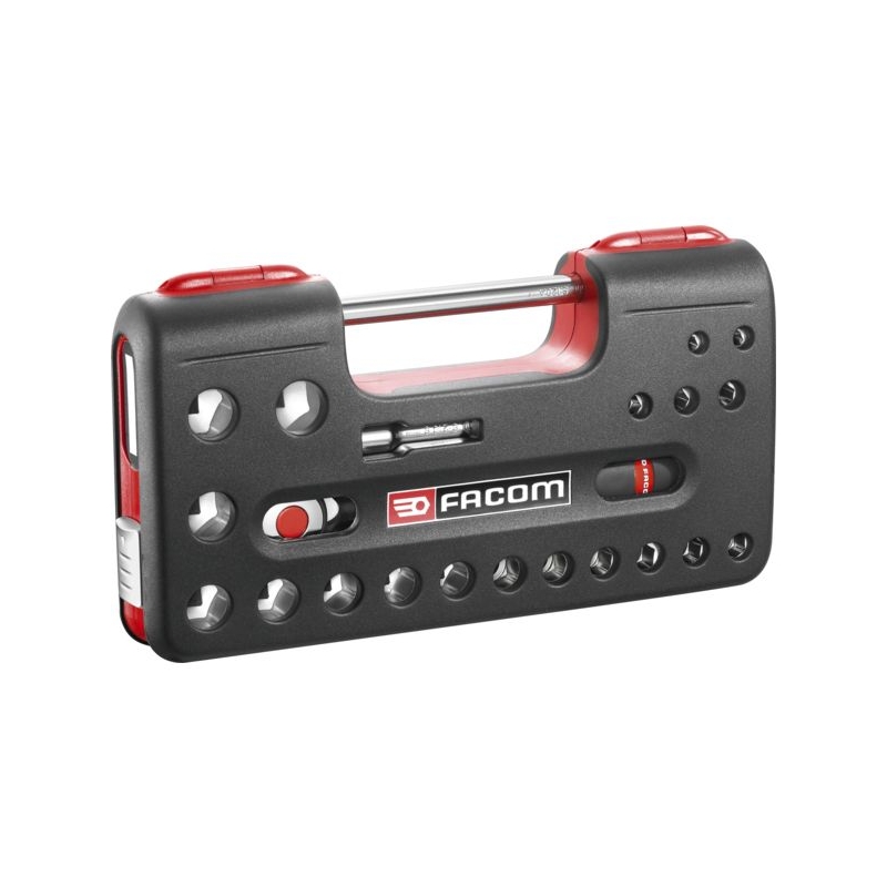 Coffret bi-matière. Inventaire instantané des outils. Composé de : - 1 cliquet 1/2'' rapide S.360, mécanisme 60 dents, reprise à 6°, inversion par chapeau rotatif, - 19 douilles 6 pans 8 - 9 - 10 - 11 - 12 - 13 - 14 - 15 - 16 - 17 - 18 - 19 - 21 - 22 - 23 - 24 - 27 - 30 - 32 mm, - 1 rallonge angulaire, - 1 poignée coulissante.