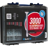 Tête fraisée, empreinte cruciforme. Acier zingué. Filetage total. Composé de 3000 vis autoperceuses : - Ø 3,5 x 13 mm (250 pièces), - Ø 3,5 x 16 mm (200 pièces), - Ø 3,5 x 19 mm (150 pièces), - Ø 3,9 x 13 mm (350 pièces), - Ø 3,9 x 16 mm (300 pièces), - Ø 3,9 x 19 mm (250 pièces), - Ø 4,2 x 19 mm (200 pièces), - Ø 4,2 x 25 mm (200 pièces), - Ø 4,2 x 32 mm (130 pièces), - Ø 4,2 x 38 mm (150 pièces), - Ø 4,8 x 16 mm (270 pièces), - Ø 4,8 x 19 mm (150 pièces), - Ø 4,8 x 22 mm (150 pièces), - Ø 4,8 x 25 mm (150 pièces), - Ø 4,8 x 32 mm (100 pièces).