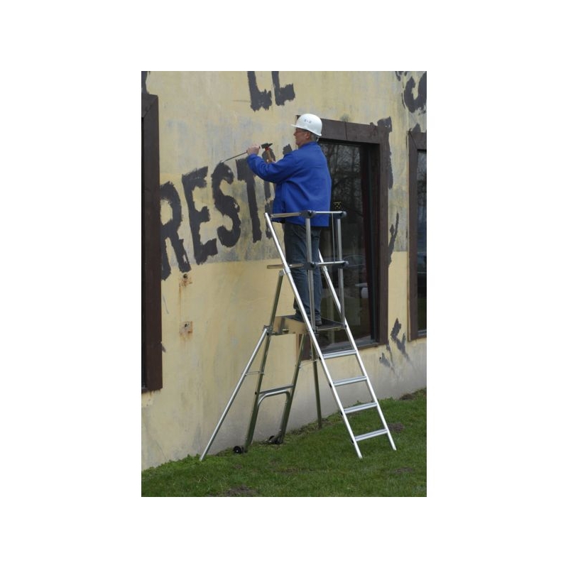 Utilisation sur sol plat. Usage intensif. En aluminium. Garde-corps fixe 360° avec portillon semi-automatique rigide. Plate-forme 400 x 490 mm avec plinthes intégrées. Marches striées antidérapantes de 60 mm. Tablette porte-outils. 2 roulettes Ø 100 mm pour les déplacements. Béquille arrière adaptée pour le passage des WC (sauf modèle 2 marches). Modèles 4 et 5 marches avec stabilisateurs. Charge maxi. : 150 kg Norme : PIRL NFP 93353 - Décret 2004.924