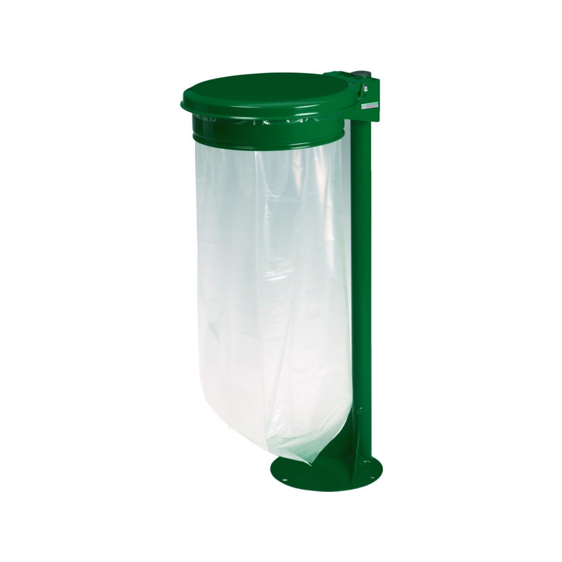 En acier poudré anti-UV vert avec poteau à fixer. Maintien du sac par ceinture élastique. Adapté au Plan Vigipirate. Fixation au sol en 3 points, platine Ø 280 mm soudée au poteau. Livré monté. S'utilise avec des sacs de 110 l. Version avec ou sans couvercle métallique.