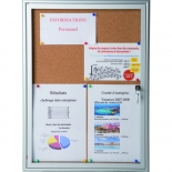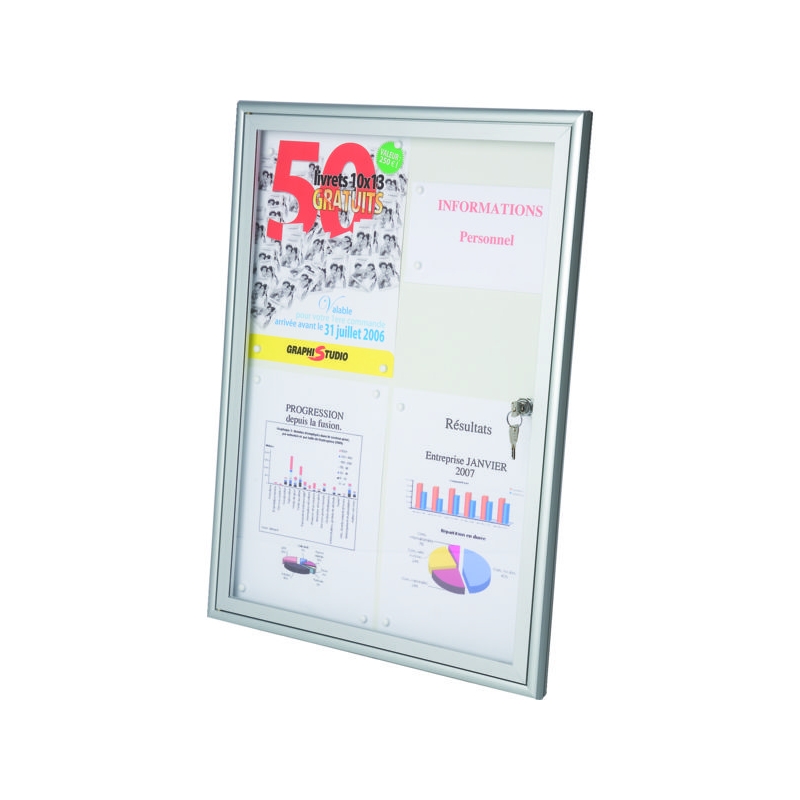 Porte battante démontable, encadrement aluminium et vitrage méthacrylate. Serrure à clé dans le vitrage. Fixation murale 4 points. Épaisseur hors-tout : 32 mm Épaisseur utile fond tôle/liège : 22/13 mm Version en verre Securit 4 mm d'épaisseur sur consultation.